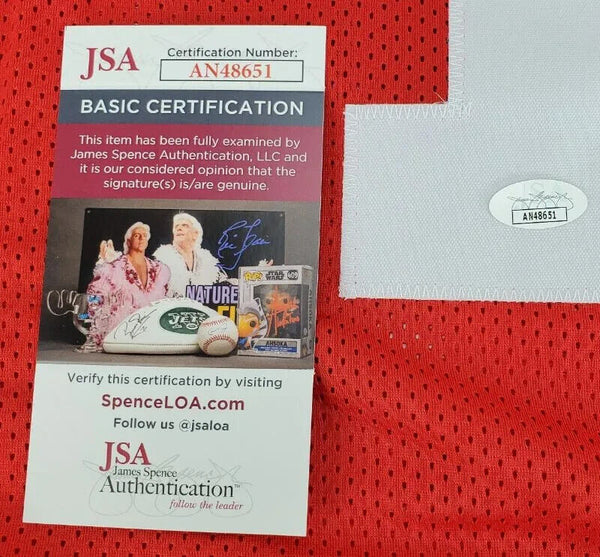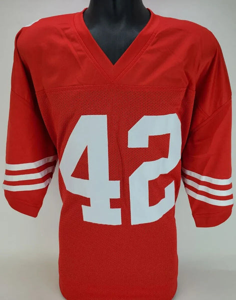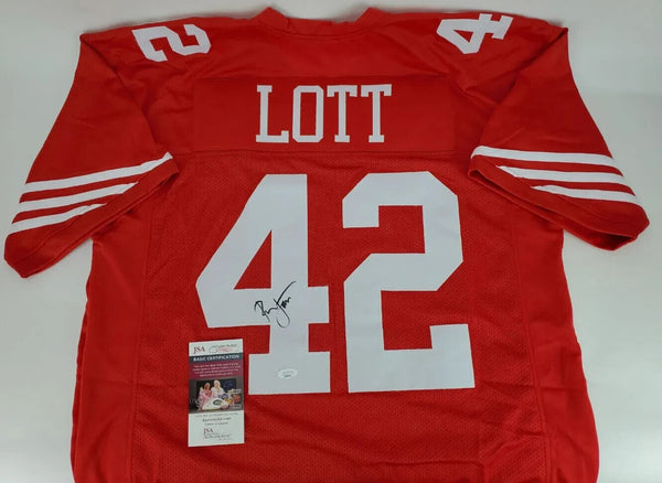 This autographed jersey has been personally hand-signed by Ronnie Lott of the San Francisco 49ers. This autograph is certified by James Spence Authentication (JSA). It comes with the numbered hologram and matching Certificate of Authenticity.Custom on-field style jerseys are a more affordable option for autograph seekers. These jerseys do not have any brand name or tags and are made in the Philippines. They feature stitched on names and numbers and are made to look very similar to the on-field jerseys that the players wear. These custom jerseys are very commonly used in the memorabilia industry.