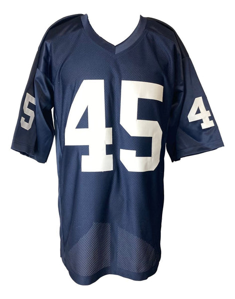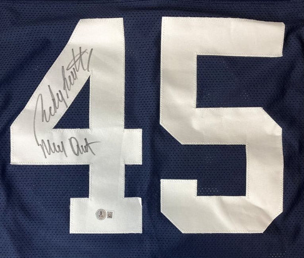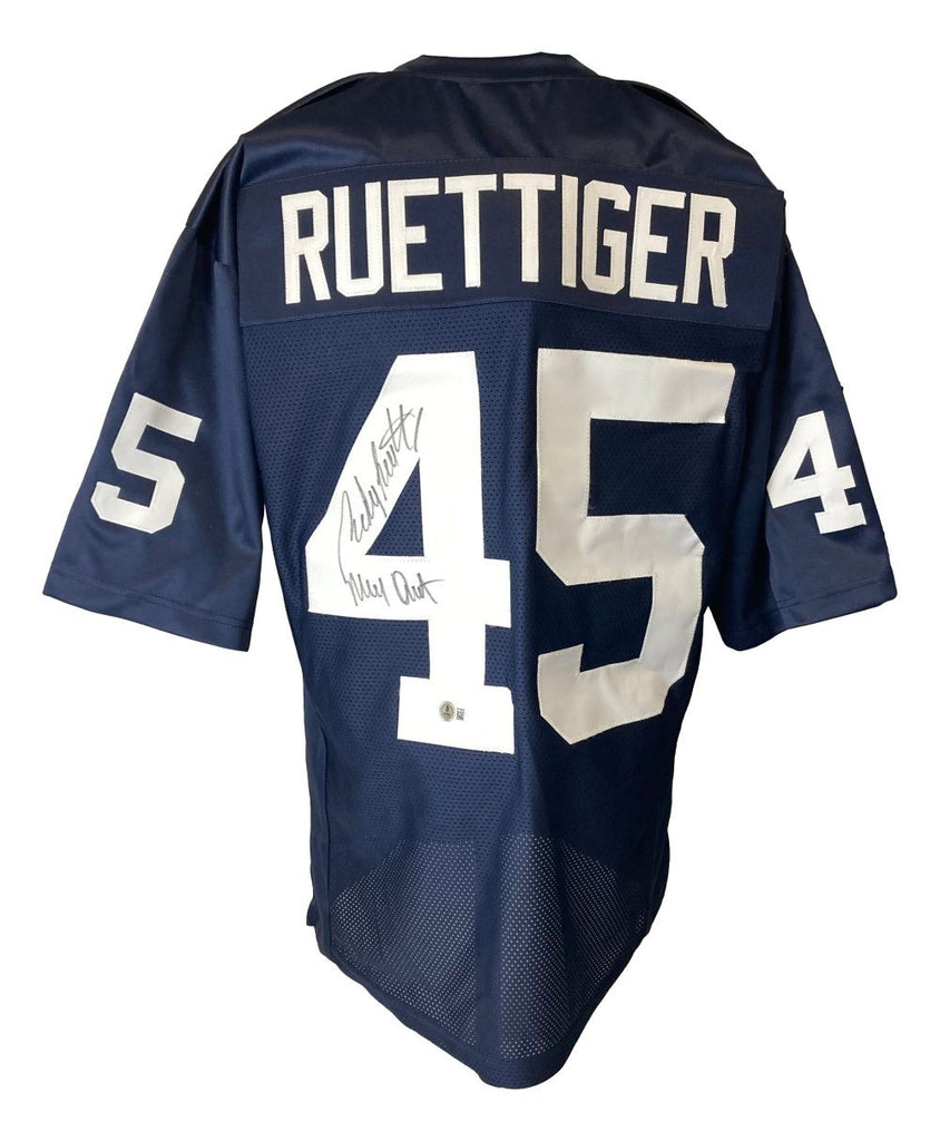 Featured is a Rudy Ruettiger signed custom football jersey, inscribed "Never Quit". This jersey has been hand signed by Ruettiger and comes with the Beckett hologram and certificate of authenticity. This jersey features professionally sewn letters and numbers and is size XL. This jersey has no team tags or emblems and is intended as a sports collectible. This jersey would make a great addition to any sports memorabilia collection!. SPECIFICATIONS Autographed By: Rudy Ruettiger Team: Notre Dame Sport: Football Authentication: Beckett Grading Services