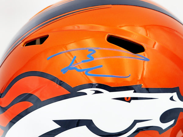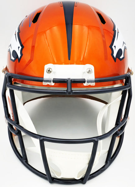 This is a Denver Broncos Flash Orange Full Size Replica Speed Helmet that has been hand signed by Russell Wilson. The Flash helmets are delicate and may have some marks or scratches on them. This item has been certified authentic by Fanatics and comes with their tamper-proof sticker.
