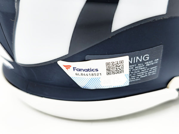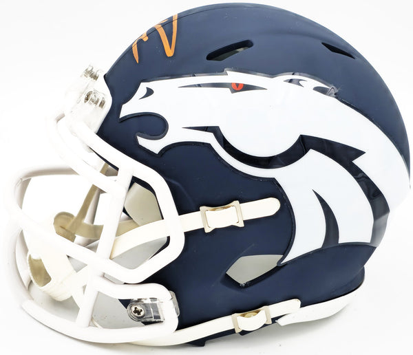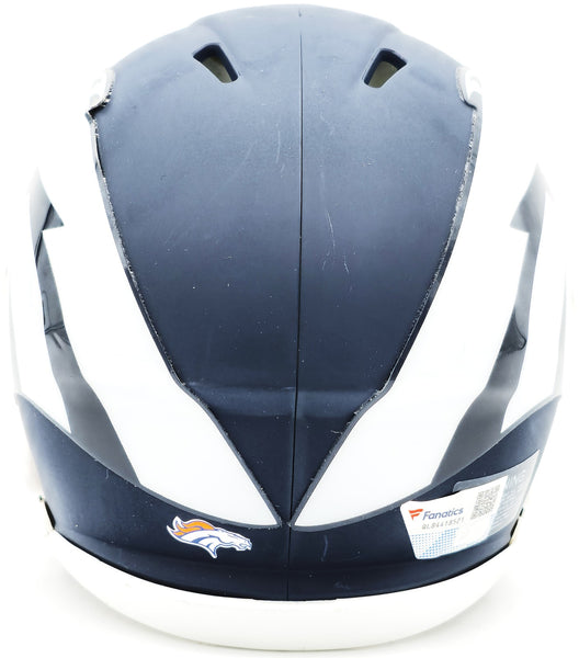 This is a Denver Broncos AMP Blue Speed Mini Helmet that has been hand signed by Russell Wilson. This item has been certified authentic by Fanatics and comes with their tamper-proof sticker.