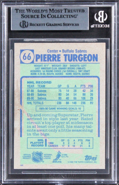 This Autographed 1990 Topps #66 Card has been Personally Signed by Pierre Turgeon of the Buffalo Sabres. This item is 100% Authentic, it comes slabbed and authenticated by Beckett Authentication Services. The authenticity can be verified on Beckett Authentication Services website.