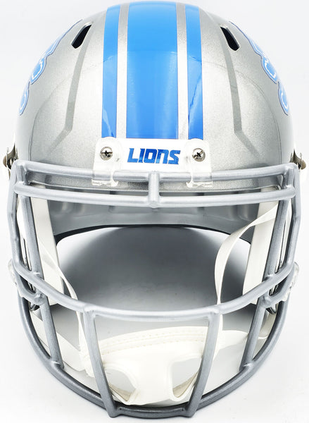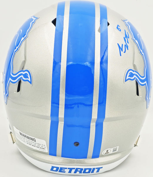 This is a Detroit Lions Silver Full Size Replica Speed Helmet that has been hand signed by Sam LaPorta. This item has been witnessed and certified authentic by Beckett Authentication (BAS) and comes with their tamper-proof witness sticker.