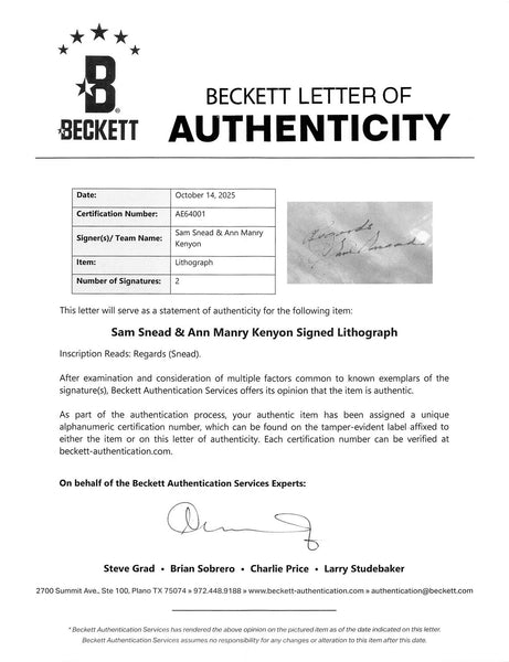 This Autographed 18x22 Lithograph with the inscription of "Regards (Snead)" has been Personally Signed by Sam Snead & Ann Manry Kenyon. This item is 100% Authentic to include a Certificate of Authenticity (COA) / hologram by Beckett Authentication Services. The authenticity can be verified on Beckett Authentication Services website. There is wear throughout and some light moisture damage along the edges. Please refer to photos for condition prior to purchase.