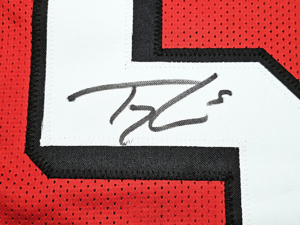 This is a Red Jersey that has been hand signed by Trey Lance. This is a custom jersey with no name brand. The approximate size is XL. It has nice sewn in name and numbers. This item has been witnessed and certified authentic by Beckett Authentication (BAS) and comes with their tamper-proof witness sticker. Beckett Authentication has recently changed their physical certificate card policy where they no longer match their tamper-proof sticker with a physical certificate. A certificate can be printed on Beckett's website for the matching authentication number.