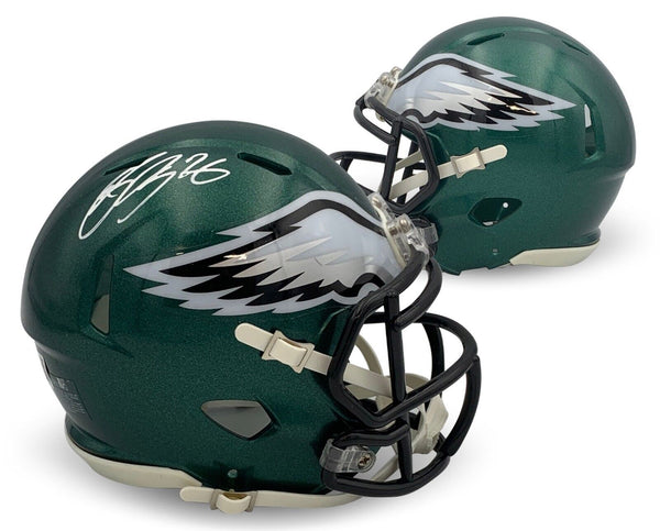 Saquon Barkley Autographed Philadelphia Eagles Signed Football Mini Helmet Beckett COA is a stunning collectible for football fans and memorabilia enthusiasts. This mini helmet features Barkleys authenticated signature verified by Beckett COA and the eye-catching design adds an extra level of appeal. Perfect for display this piece highlights the talent and impact of one of the NFLs most dynamic players. Add this unique item to your collection today.Stock image.
