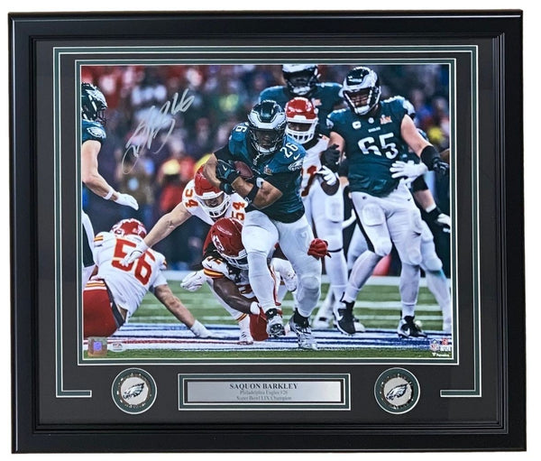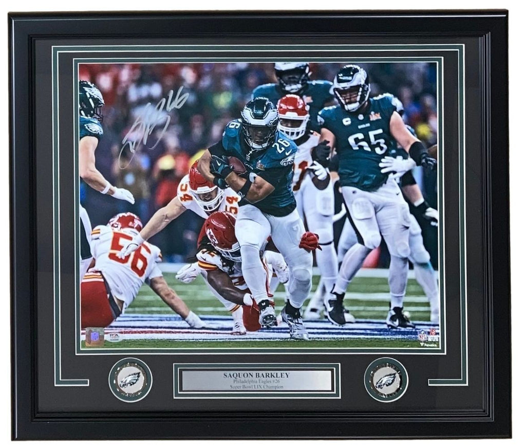 Featured is a Saquon Barkley signed 16x20 Philadelphia Eagles Super Bowl photo. This photo has been hand signed by Barkley and comes with the PSA/DNA witnessed hologram. This photo has been professionally framed and matted and is approximately 22x27. This photo would make a great addition to any sports memorabilia collection! SPECIFICATIONS Autographed By: Saquon Barkley Team: Philadelphia Eagles Sport: Football Authentication: PSA/DNA Authentication Services