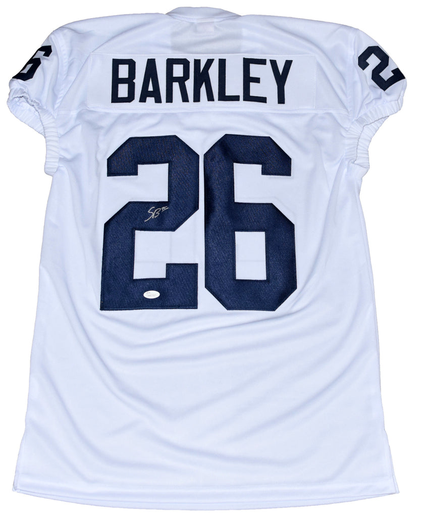 Saquon Barkley, former All-American running back for the Penn State Nittany Lions, has hand signed this white custom game cut jersey at a private signing. Jersey is size XL and all letters/numbers are sewn-on. This item comes with a certificate of authenticity (COA) from JSA - James Spence Authentication and was signed in the presence of one of their representatives. You will receive a serial-numbered COA along with a matching serial-numbered sticker on the jersey. The authenticity can be verified online by entering the serial number.Item pictured may not be the exact item you will receive. It will be similar quality, and we guarantee your satisfaction.