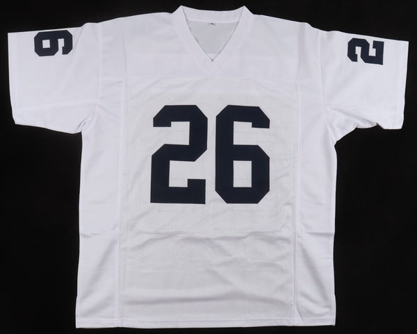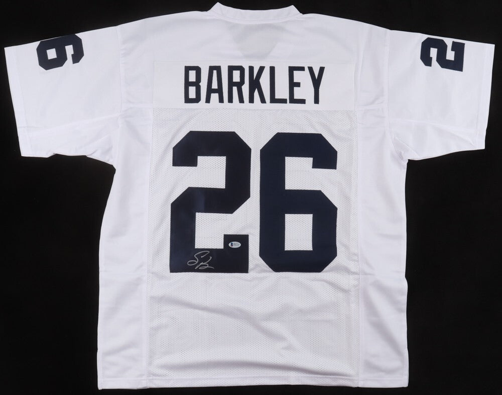 Custom on-field style jersey. Everything sewn on, size XL. Hand-signed by Saquon Barkley.The autograph includes an official Beckett Authentication Services serially numbered hologram and QR Code card for authenticity purposes.Authentication: Beckett Hologram with QR Code cardOn all signed jerseys up for auction stock images are used in these listings. ALMOST ALL OUR SIGNED JERSEYS ARE ADULT XL unless otherwise noted (It's the preferred size for autograph collectors for display purposes) The exact item you will receive will be the Same player as the one pictured, but may have the signature in different spots, be signed in a different color paint pen, and have different inscriptions than the photo shown. WE ARE NOT A WHOLESALER; WE TRY TO OFFER LOW PRICED SIGNED JERSEYS TO OUR CUSTOMERS SO EVERYONE GETS A FAIR CHANCE AT LOW PRICES ON QUALITY ITEMS. If you're buying multiple items, please don't pay until you purchase all your auction items for that week (Thursday thru Sunday) We'll send you an invoice when all our weekly auctions are over on either Saturday or Sunday evening at 10:30 pm depending on how many items we have listed that week. We will adjust your shipping at this point. On some items that we have 2 dozen or more of in stock we may offer a 2nd chance after the auction ends. If you purchase via 2nd chance offers, please click on the items you wish to buy & then message us to adjust the shipping before you make any payments to us. Thank you & Happy Bidding ALL INTERNATIONAL SHIPPING ON THESE ITEMS IS DONE THROUGH THE eBAY GLOBAL SHIPPING PROGRAM. PLEASE BE AWARE OF THESE COSTS BEFORE BIDDING.