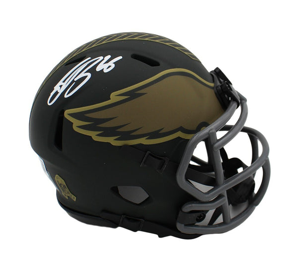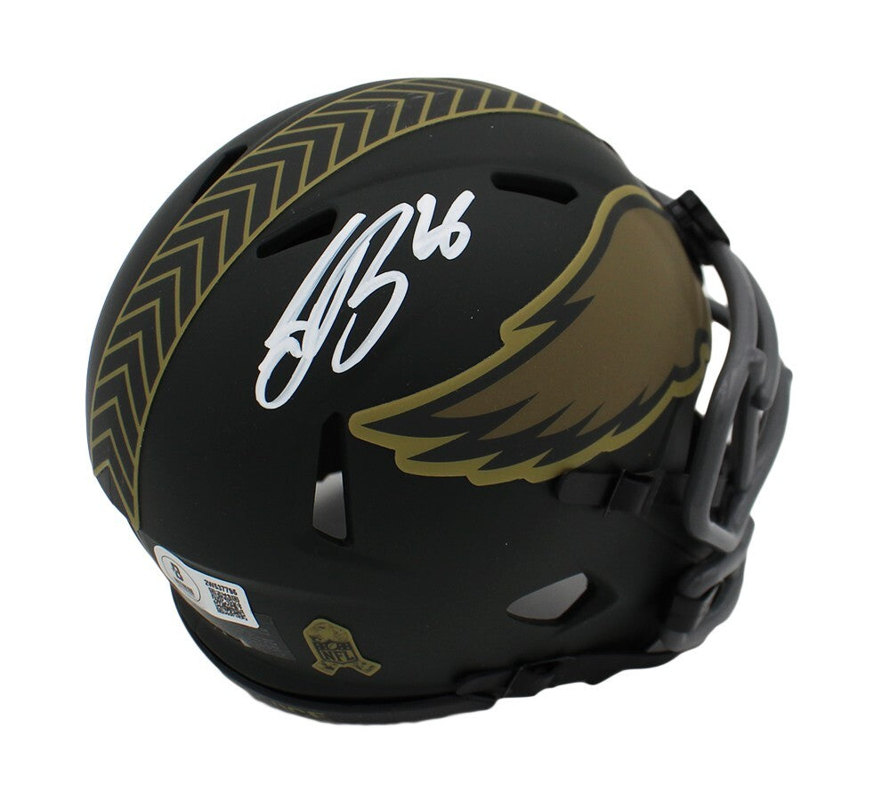 A Philadelphia Eagles Speed Salute To Service 4 NFL Mini Helmet hand signed by Saquon Barkley. The item and signature are in excellent condition. Saquon is a 2x Offensive Player of the Year, Big Ten Champion, and 2nd overall pick in the 2018 NFL Draft. AUTHENTICATION: The item is accompanied by a Beckett Serial Numbered and Databased Hologram.