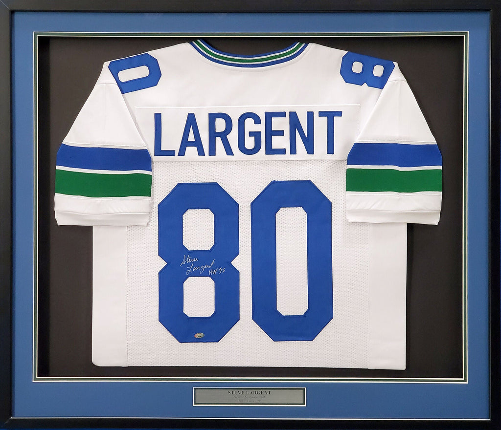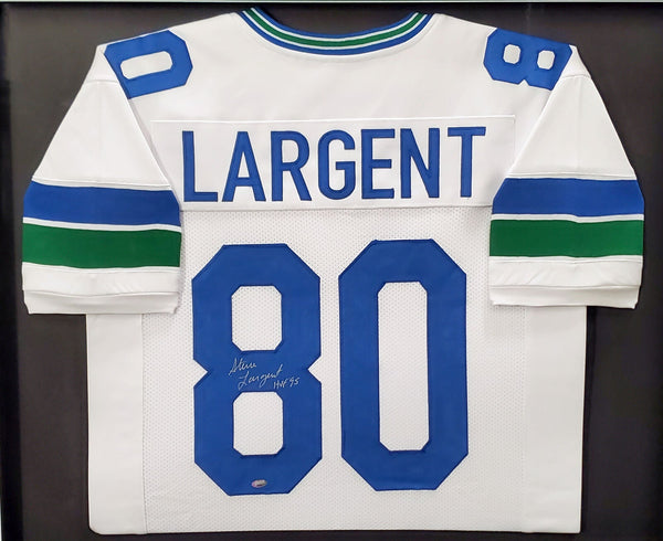 This is a framed White Jersey, approximately 31x36 with the frame, that has been hand signed by Steve Largent. This is a custom jersey with no name brand. The approximate size is XL. It has nice sewn in name and numbers. This item was inscribed "HOF 95." This item was signed in the presence of a Mill Creek Sports representative and comes with their serial numbered hologram and matching certificate of authenticity.