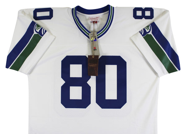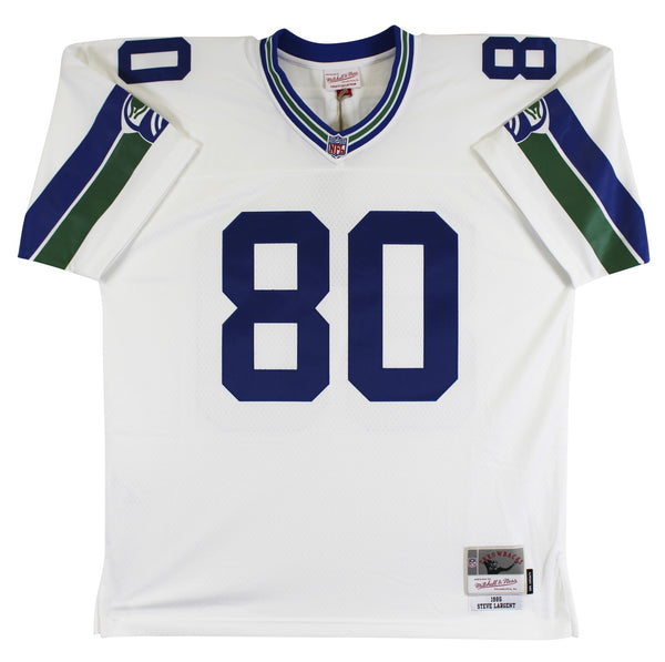 This Autographed White Mitchell & Ness Throwback Jersey with the inscription of "HOF 1995, 1985 All Pro, 7x Pro Bowl, 1980s All Decade Team, NFL 100" has been Personally Signed by Steve Largent of the Seattle Seahawks. This item is 100% Authentic to include a hologram by Beckett Authentication Services. This item will come with an affixed Beckett Authentication Services (BAS) authentication sticker, which includes a scannable QR code to verify authenticity. Please note that Beckett no longer provides serial-numbered COA cards, and the attached BAS sticker will serve as the complete authentication for this item. This is a BAS Witnessed Protection Program item which means a Beckett Authentication Service representative was present when this item was being signed. We conducted an autograph signing with Steve Largent where multiples of the same item were signed. While the photographs are representative of this item, the size, placement and strength of the signature may vary. Each item is hand signed, therefore, each autograph is unique. This item can be verified through BAS Witnessed. This is a X-Large sized Jersey.