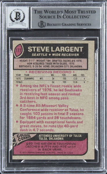 This Autographed Auto Graded Gem Mint 10! 1977 Topps #177 Card with the inscription of "HOF 95" has been Personally Signed by Steve Largent of the Seattle Seahawks. This item is 100% Authentic, it comes slabbed and authenticated by Beckett Authentication Services. The authenticity can be verified on Beckett Authentication Services website.