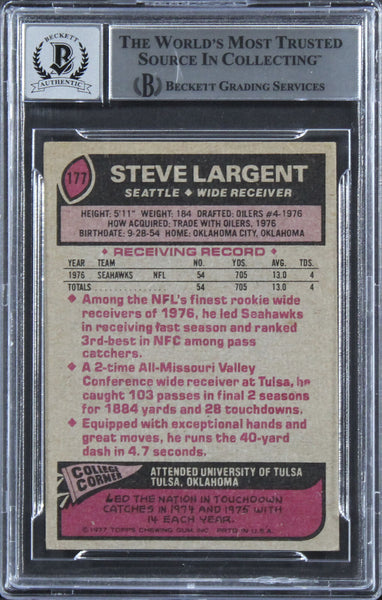 This Autographed Auto Graded Gem Mint 10! 1977 Topps #177 Card with the inscription of "HOF 95" has been Personally Signed by Steve Largent of the Seattle Seahawks. This item is 100% Authentic, it comes slabbed and authenticated by Beckett Authentication Services. We have multiples of this same item. While the photographs are representative of this item, the size and placement of the signature may vary. Each item is hand signed, therefore, each autograph is unique.