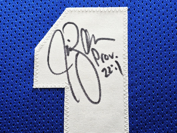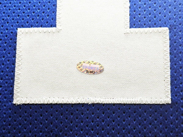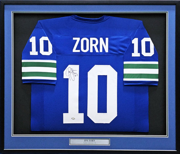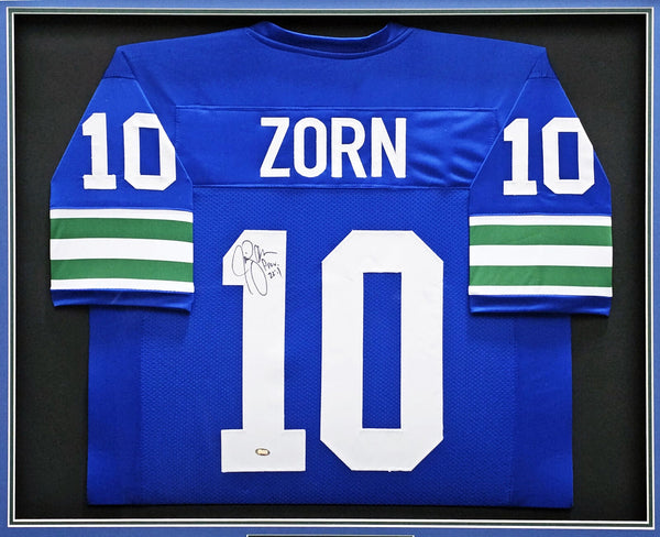 This is a framed Blue Jersey, approximately 31x36 with the frame, that has been hand signed by Jim Zorn. This is a custom jersey with no name brand. The approximate size is XL. It has nice sewn in name and numbers. This item was signed in the presence of a Mill Creek Sports representative and comes with their serial numbered hologram and matching certificate of authenticity.