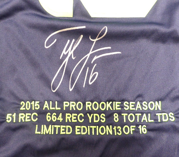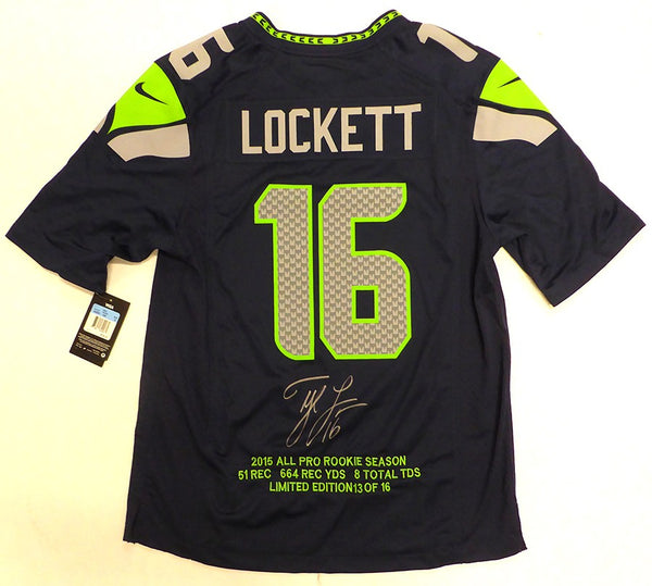 This is a Blue Nike Seattle Seahawks Jersey that has been hand signed by Tyler Lockett. NOTE: The numbers appear a little crooked, as shown in the pictures. This item was signed in the presence of a Mill Creek Sports representative and comes with their serial numbered hologram and matching certificate of authenticity.