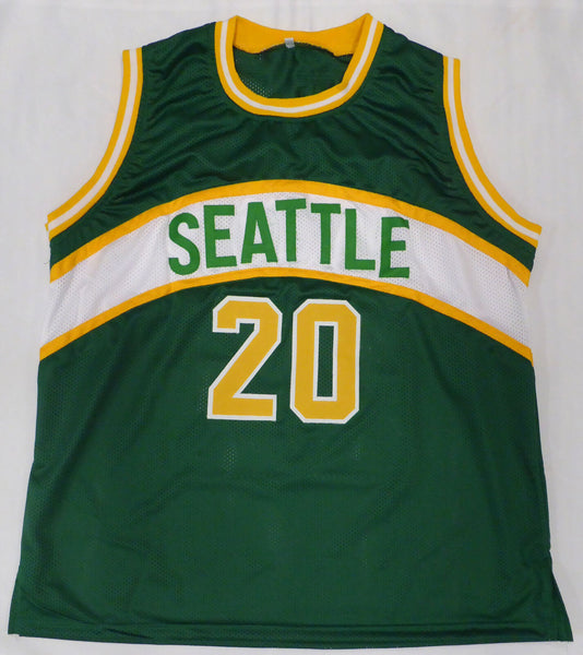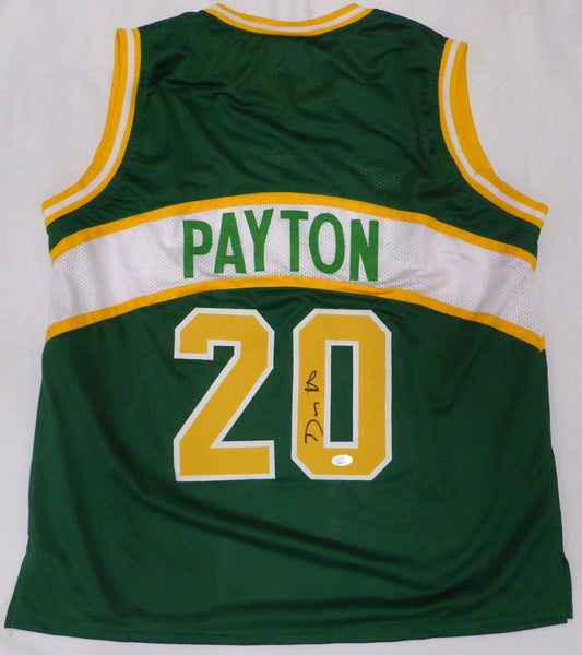 This is a Green Jersey that has been hand signed by Gary Payton. This is a custom jersey with no name brand. The approximate size is XL. It has nice sewn in name and numbers. This item has been certified authentic by JSA and comes with their tamper-proof sticker and matching certificate of authenticity.