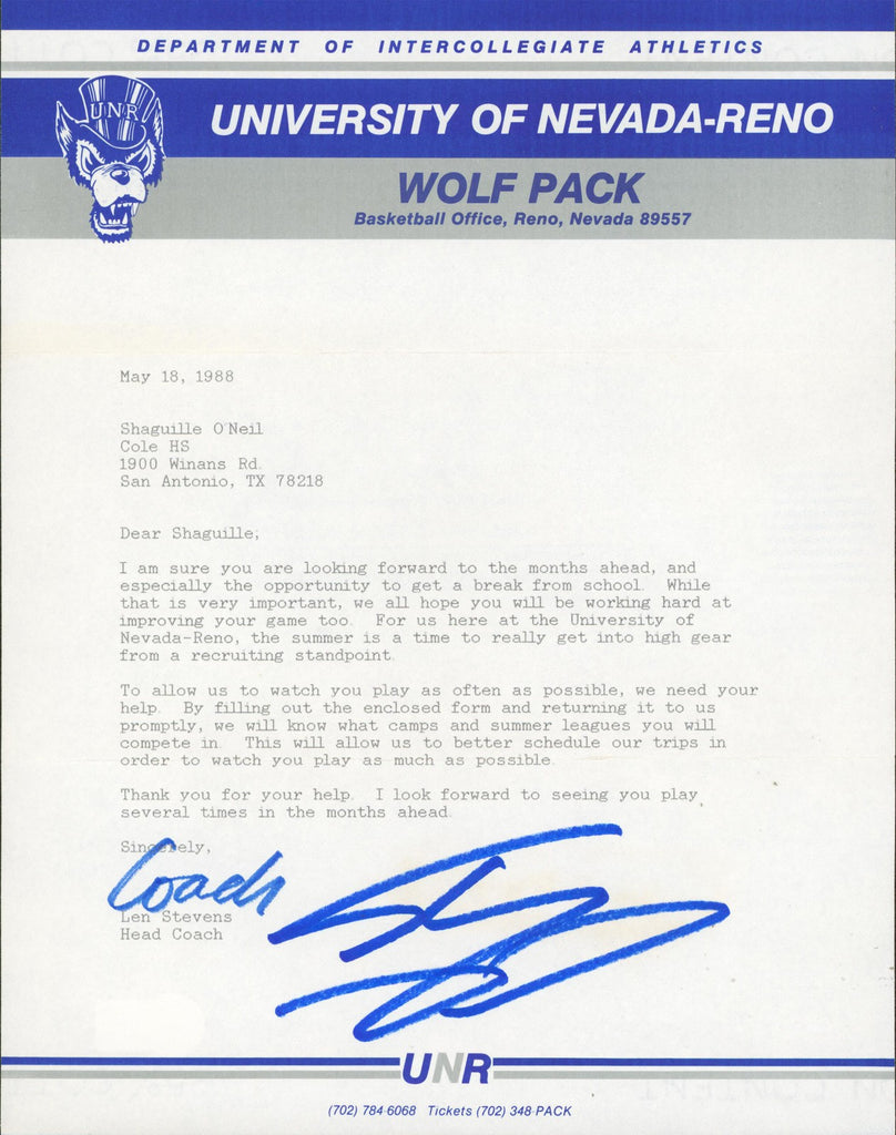 This is a 1988 University of Nevada-Reno Shaquille O'Neal Recruitment Envelope & Letter has been written to Shaquille O'Neal. This recruitment letter was signed by Len Stevens, the Head Basketball Coach of University of Nevada-Reno. Stevens' signature is not authenticated. This recruitment letter will come with a Letter of Authenticity from Shaquille O'Neal, which has been signed in the presence of a Beckett representative. This letter will come with its original envelope, which has also been signed and Witnessed by Beckett. This letter was was kept in Shaquille O'Neal's personal collection since it was received.