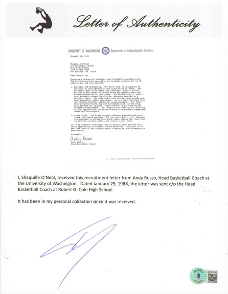 This is a 1988 University of Washington Shaquille O'Neal Recruitment Letter has been written to Shaquille O'Neal. This recruitment letter was signed by Andy Russo, the Head Basketball Coach of University of Washington as well as Shaquille O'Neal. Russo's signature is not authenticated. This recruitment letter will come with a Letter of Authenticity from Shaquille O'Neal, which has been signed in the presence of a Beckett representative. This letter was was kept in Shaquille O'Neal's personal collection since it was received.