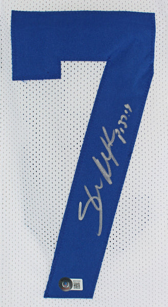 This Autographed White Pro Style Jersey has been Personally Signed by Shaun Alexander of the Seattle Seahawks. This item is 100% Authentic to include a hologram by Beckett Authentication Services. This item will come with the new Beckett Authentication hologram that has a scannable QR code rather than the traditional COA. If you would like to have a COA, you are welcome to reach out to Beckett for a printed certification once you receive your item. This is a BAS Witnessed Protection Program item which means a Beckett Authentication Service representative was present when this item was being signed. We conducted an autograph signing with Shaun Alexander where multiples of the same item were signed. While the photographs are representative of this item, the size, placement and strength of the signature may vary. Each item is hand signed, therefore, each autograph is unique. This item can be verified through BAS Witnessed. This is a X-Large sized, non-branded, custom-stitched Jersey.