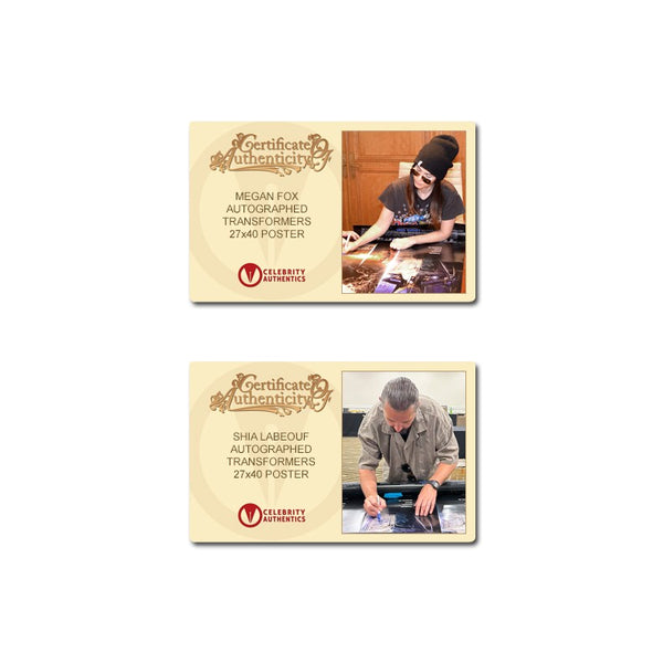 This fantastic 2007 Transformers Original 27x40 Double-Sided Movie Poster has been personally hand-signed by the film's leading stars, Shia LaBeouf and Megan Fox during their signings with Celebrity Authentics. The fate of humanity is at stake when two races of robots, the good Autobots and the villainous Decepticons, bring their war to Earth. The robots have the ability to change into different mechanical objects as they seek the key to ultimate power, but only human Sam Witwicky can save the world from total destruction. This rare piece ships affixed with Celebrity Authentics serial-numbered and tamper evident Authentication Hologram and includes Celebrity Authentics Certificates of Authenticity featuring picture of Shia and Megan signing the poster. Please note: with multiples signed by the actor, a sample photo is used from stock to represent what you will receive. Exact autograph size and placement may vary.