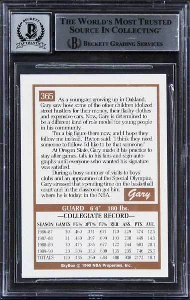 This Autographed Auto Graded Gem Mint 10! 1990 Skybox #365 Rookie Card has been Personally Signed by Gary Payton of the Seattle Supersonics. This item is 100% Authentic, it comes slabbed and authenticated by Beckett Authentication Services. We have multiples of this same item. While the photographs are representative of this item, the size and placement of the signature may vary. Each item is hand signed, therefore, each autograph is unique.
