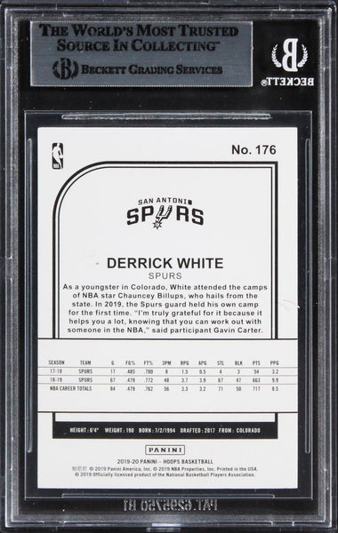 This Autographed 2019 Hoops #176 Card has been Personally Signed by Derrick White of the San Antonio Spurs. This item is 100% Authentic, it comes slabbed and authenticated by Beckett Authentication Services. The authenticity can be verified on Beckett Authentication Services website.