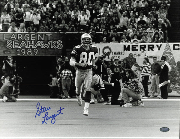 This is an 11x14 Photo that has been hand signed by Steve Largent. This item was inscribed "HOF 95." This item was signed in the presence of a Mill Creek Sports representative and comes with their serial numbered hologram and matching certificate of authenticity.