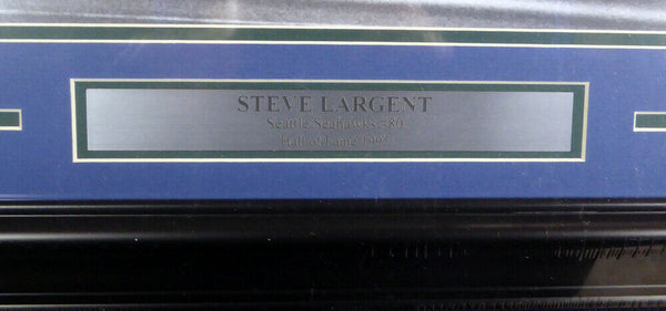 This is a framed 16x20, approximately 24x28 with the frame, that has been hand signed by Steve Largent. It comes with a custom tamper-evident serial numbered hologram and Certificate of Authenticity from our company, Mill Creek Sports.