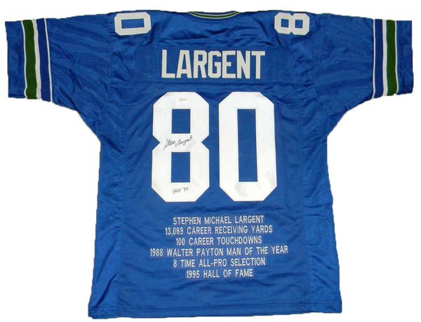 Steve Largent, former Hall of Fame wide receiver for the Seattle Seahawks, has hand signed this custom stat jersey at a private signing. He included the inscription "HOF 95". Jersey is size XL and all letters/numbers are sewn-on. This item comes with a certificate of authenticity (COA) from JSA - James Spence Authentication and was signed in the presence of one of their representatives. You will receive a serial-numbered COA along with a matching serial-numbered sticker on the jersey. The authenticity can be verified online by entering the serial number.Item pictured may not be the exact item you will receive. It will be similar quality, and we guarantee your satisfaction.