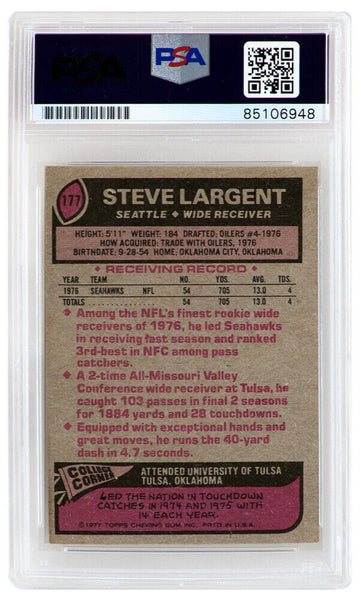 Steve Largent signed Seattle Seahawks 1977 Topps rookie football trading card #177 with 'HOF 95' inscription. The card has been authenticated and encapsulated by PSA/DNA and the number can be verified online.