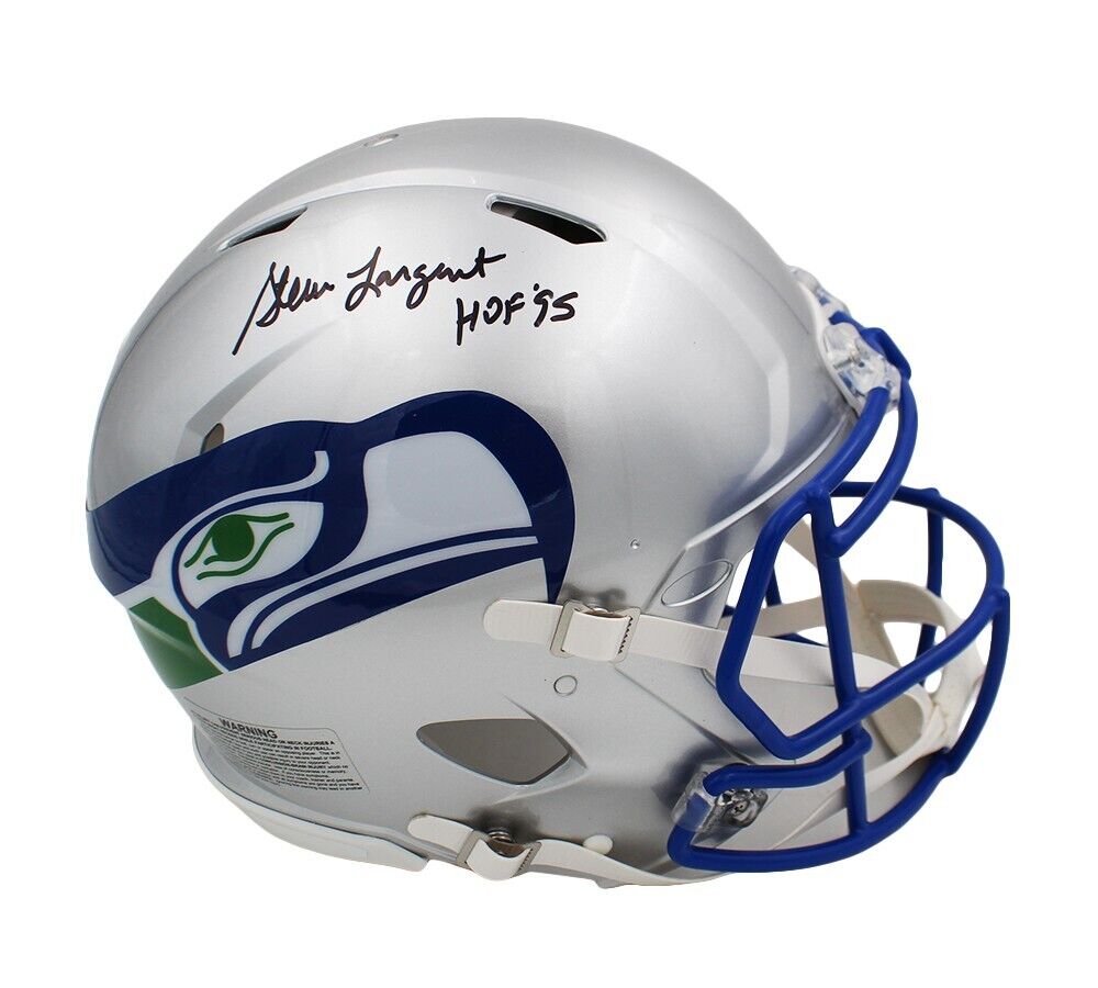 A Seattle Seahawks Speed Authentic Throwback NFL Helmet hand signed by Steve Largent. The item and signature are in excellent condition. In addition to signing his name, Steve also inscribed "HOF 95" on the item. Steve was drafted into the NFL in 1976 in the fourth round, 117th pick overall. Steve was NFL Man of the Year (1988), First-team All-Pro (1985), and 7x Pro Bowler (1978,1979,1984-1985). AUTHENTICATION: Your item has been tagged with a SmarTag powered by Prova Technology, which gives you digital access to your items authentication records, including a proof picture from the signing.
