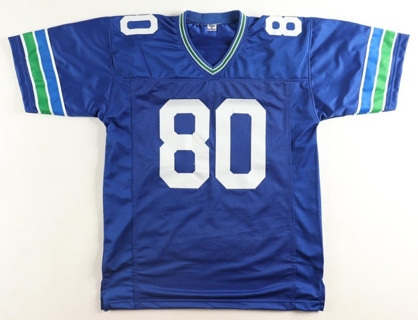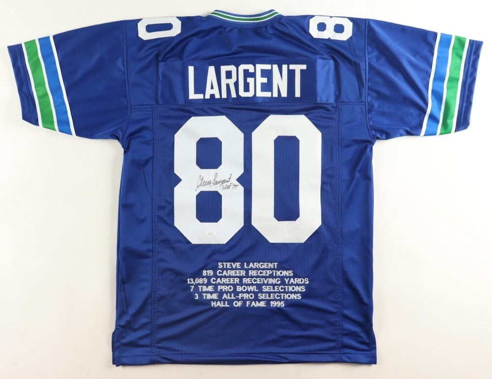 Custom on-field style jersey. Everything is sewn on, size XL. Has been hand-signed and inscribed in black felt-tip pen by Steve Largent (HOF).Please note, the Career Receiving Touchdowns on the jersey is incorrect. Largent had 13,089 receiving yards and scored 101 touchdowns.The lot / autograph(s) includes an official James Spence Authentication serially numbered hologram and QR Code Card for authenticity purposes.Authentication: JSA Hologram & QR Code Card
