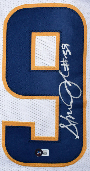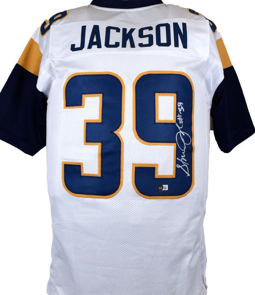 Steven Jackson Autographed White Pro Style Jersey - Beckett W Hologram *Silver THIS IS NOT AN NFL JERSEY. THIS HAS NO TAGS, NO LOGOS, NO EMBLEMS. This is a hand autograph of Steven Jackson on a Custom Made (non name brand) Authentic Style Jersey with stitched letters and numbers. This item has a Beckett Witness Authentication, which comes with a Beckett numbered hologram and a QR code for verification. You can view this item on the Beckett Authentication website. It was signed either at a public autograph appearance or a private signing. This is a stock photo of the item. Although you may not receive this exact item, the item you receive is virtually identical and brand new in great shape. Jersey size is XL.