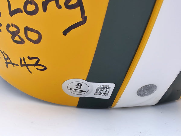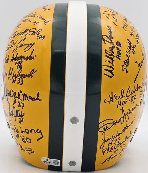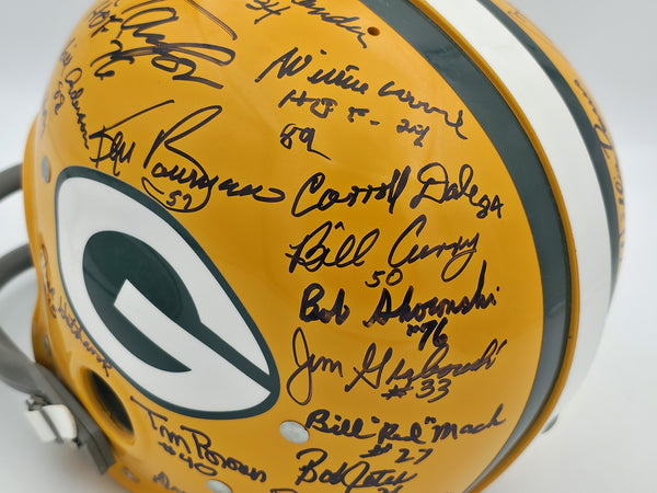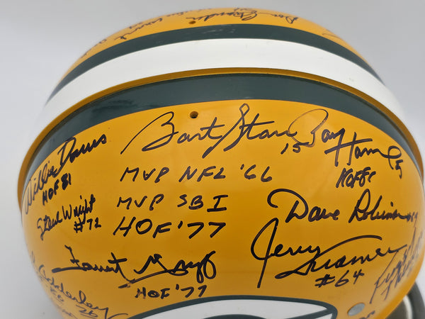This is a Yellow Full Size Replica Helmet that has been hand signed by 32 members of the 1966 Super Bowl I Champions Green Bay Packers Team. Includes Jim Taylor, Bart Starr, Paul Hornung, Willie Wood, Jerry Kramer, Dave Robinson, Willie Davis, Forrest Gregg, Herb Adderley. Also signed by Fuzzy Thurston, Boyd Dowler, Zeke Bratkowski, Steve Wright, Donny Anderson, Jim Weatherwax, Phil Vandersee, Gabe Gillingham, Don Chandler, Ken Bowman, Bill Curry, Carroll Dale, Bob Skoronski, Jim Grabowski, Bill Mack, Bob Jeter, Bob Long, Doug Hart, Tim Brown, Marv Flemming, Bill Anderson, Dave Hathcock, Allen Brown. This item has been certified authentic by Beckett Authentication (BAS) and comes with their tamper-proof hologram and matching full-page certificate of authenticity.