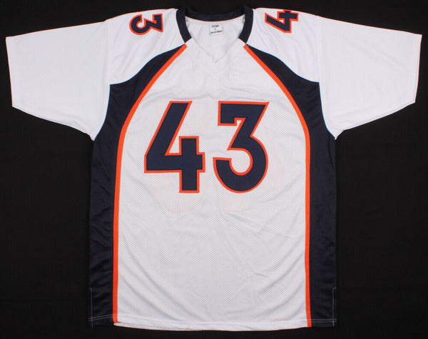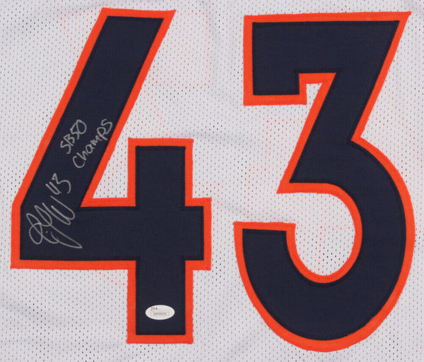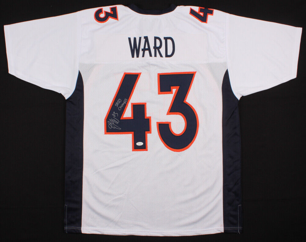 Custom on-field style jersey. Everything sewn on, size XL. Hand-signed and inscribed in silver felt-tip pen by T. J. Ward. The lot / autograph(s) includes an official James Spence Authentication (JSA) hologram for authenticity purposes. The signing of this item was witnessed by JSA.Authentication: JSA Hologram