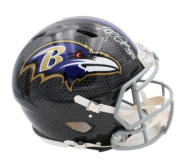 An Baltimore Ravens Speed Authentic Hydro NFL Helmet hand signed by Terrell Suggs. The item and signature are in excellent condition. Terrell Suggs is a former American football outside linebacker. He played college football at Arizona State, and was recognized as a unanimous All-American. He was drafted by the Baltimore Ravens in 2003. He is a 2x SB Champion and a 7x Pro Bowler. AUTHENTICATION: The item features a Beckett Certificate of Authenticity - Beckett Serial Numbered and Databased Hologram