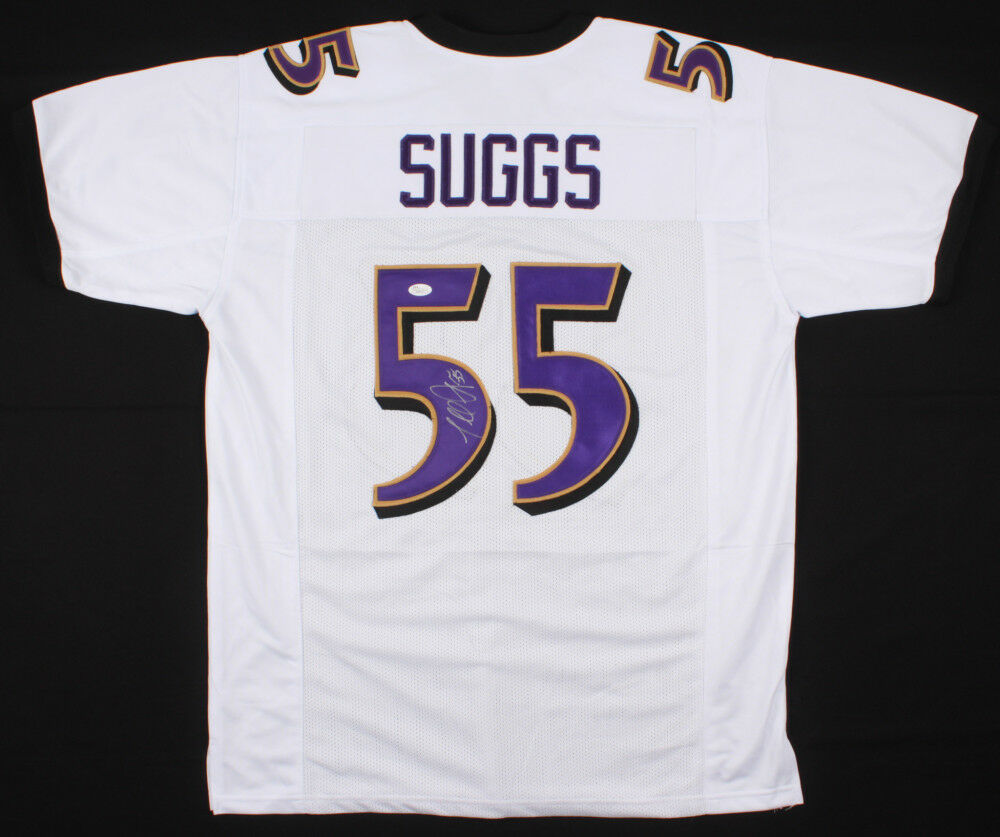 Custom on-field style jersey. Everything is sewn on, size XL. Hand-signed in silver paint pen by Terrell Suggs. The lot / autograph(s) includes an official James Spence Authentication (JSA) hologram and matching COA for authenticity purposes. The signing of this item was witnessed by JSA.Authentication: JSA COA