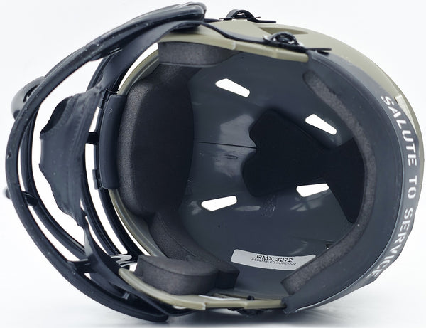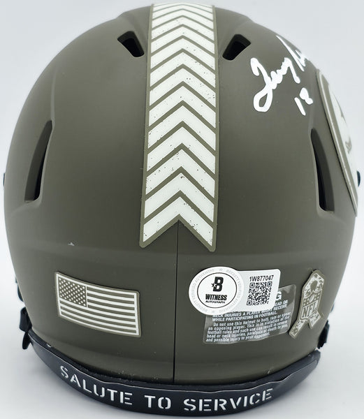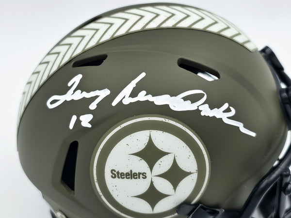 This is a Pittsburgh Steelers Army Green Salute to Service Speed Mini Helmet that has been hand signed by Terry Bradshaw. This item has been witnessed and certified authentic by Beckett Authentication (BAS) and comes with their tamper-proof witness hologram.