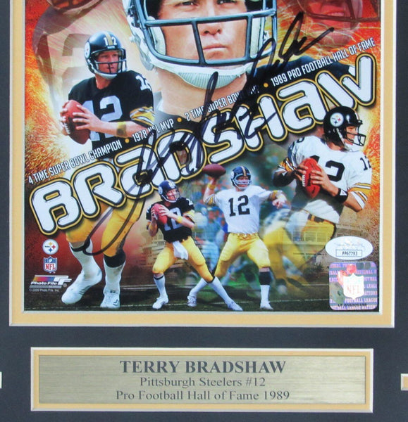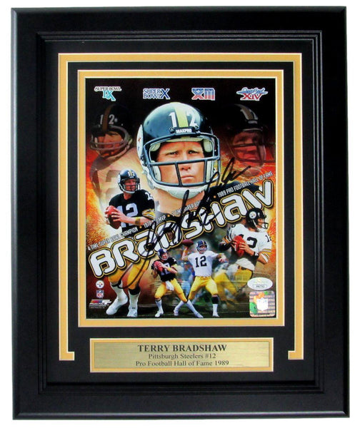 Terry Bradshaw HOF Pittsburgh Steelers Signed/Autographed 8x10 Photo Framed. The outer frame size is 13 inches x 16 inches. This photo is authenticated by JSA and includes their Tamper-proof Sticker and Certificate of Authenticity.