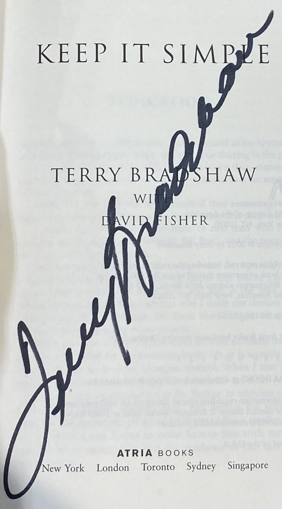 Featured is a Terry Bradshaw signed Keep It Simple book. This book has been hand signed by Bradshaw and comes with the Beckett hologram and certificate of authenticity. This book would make a great addition to any sports memorabilia collection!. SPECIFICATIONS Autographed By: Terry Bradshaw Team: Pittsburgh Steelers Sport: Football Authentication: Beckett Grading Services