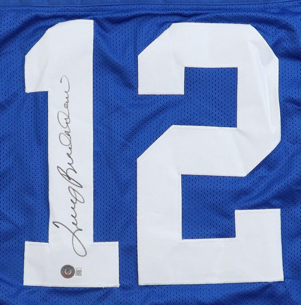 Custom on-field style jersey. Everything is sewn on, size XL. Hand-signed by Terry Bradshaw (HOF).The autograph includes an official Beckett Authentication Services serially numbered hologram and QR Code card for authenticity purposes.Authentication: Beckett Hologram with QR Code card