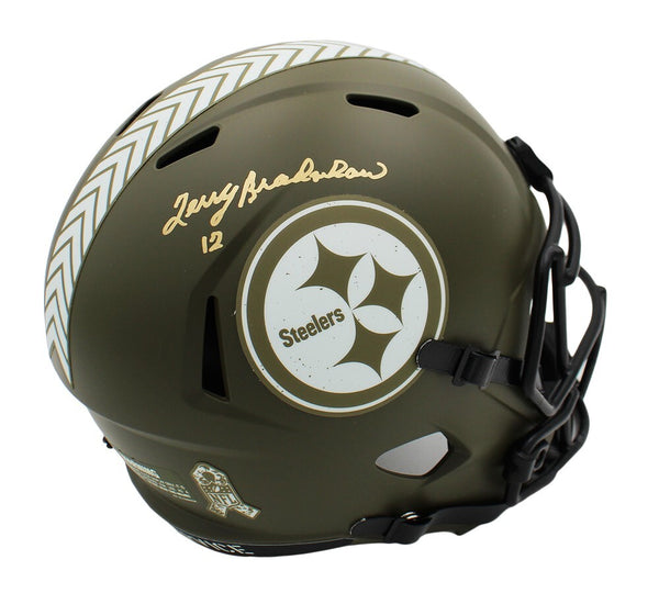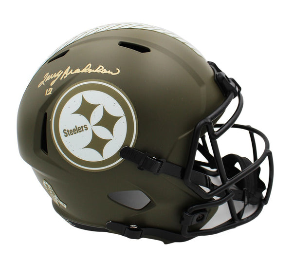 A Pittsburgh Steelers Speed Replica Salute To Service NFL Helmet hand signed by Terry Bradshaw. The item and signature are in excellent condition Terry navigated the Steelers Dynasty to Super Bowl Championships and became one of the most iconic NFL personalities of all time. AUTHENTICATION: The item has been tagged with a SmarTag powered by Prova Technology, which gives you digital access to the items authentication records, including a proof picture from the signing.