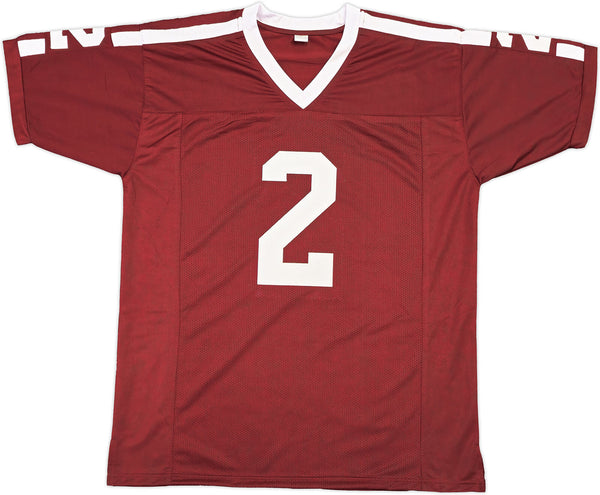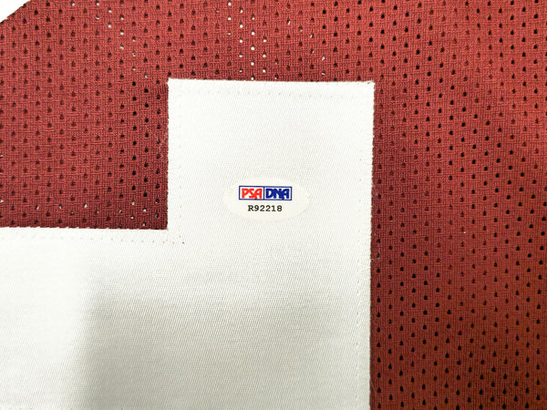 This is a Maroon Jersey that has been hand signed by Johnny Manziel. This is a custom jersey with no name brand. The approximate size is XL. It has nice sewn in name and numbers. This item has been certified authentic by PSA/DNA and comes with their tamper-proof sticker and matching certificate of authenticity.