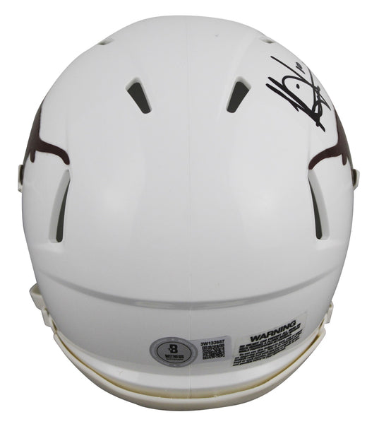 This Autographed Speed Mini Helmet has been Personally Signed by Vince Young of the Texas Longhorns. This item is 100% Authentic to include a hologram by Beckett Authentication Services. This item will come with an affixed Beckett Authentication Services (BAS) authentication sticker, which includes a scannable QR code to verify authenticity. Please note that Beckett no longer provides serial-numbered COA cards, and the attached BAS sticker will serve as the complete authentication for this item. This is a BAS Witnessed Protection Program item which means a Beckett Authentication Service representative was present when this item was being signed. We conducted an autograph signing with Vince Young where multiples of the same item were signed. While the photographs are representative of this item, the size, placement and strength of the signature may vary. Each item is hand signed, therefore, each autograph is unique. This item can be verified through BAS Witnessed.
