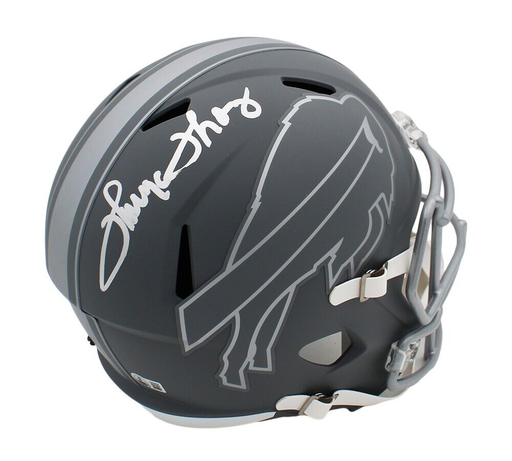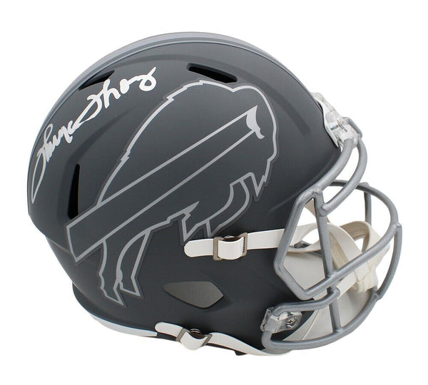 A Buffalo Bills Speed Replica Slate NFL Helmet hand signed by Thurman Thomas. The item and signature are in excellent condition. Thomas is a 5x Pro Bowler, 3x First-Team All-Pro, and was elected to the Pro Football Hall of Fame in 2007 and into the College Football Hall of Fame in 2008. AUTHENTICATION: The item is accompanied by a Beckett Serial Numbered and Databased Hologram