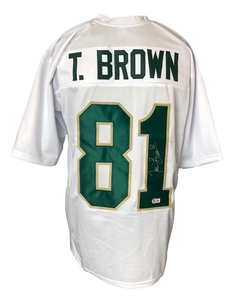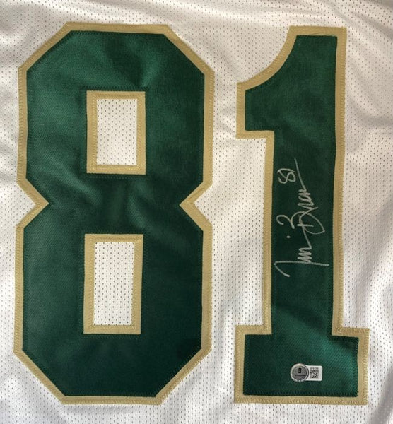 Featured is a Tim Brown signed custom football jersey. This jersey has been hand signed by Brown and comes with the Beckett hologram and certificate of authenticity. This jersey features professionally sewn letters and numbers and is size XL. This jersey has no team tags or emblems and is intended as a sports collectible. This jersey would make a great addition to any sports memorabilia collection! SPECIFICATIONS Autographed By: Tim Brown Team: Notre Dame Fighting Irish Sport: Football Authentication: Beckett Grading Services