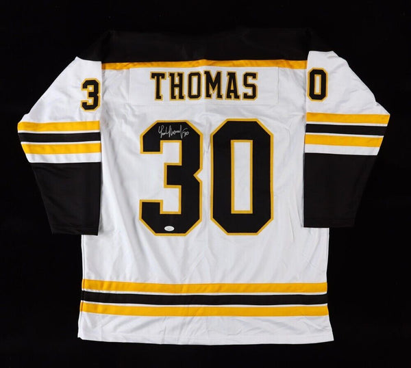 Custom on-ice style jersey. Everything is sewn on, size XL. Hand-signed and inscribed by Tim Thomas.The autograph includes an official James Spence Authentication (JSA) hologram and matching COA for authenticity purposes. The signing of this item was witnessed by JSA.Authentication: JSA COA
