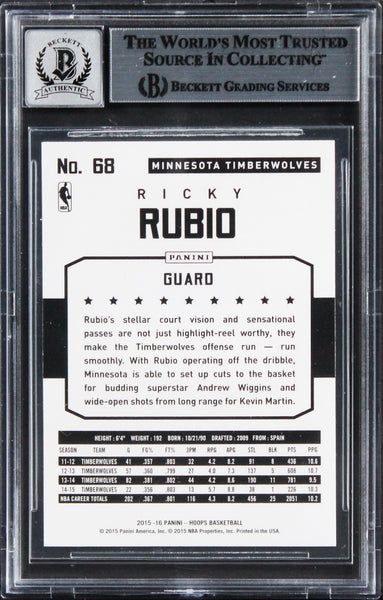 This Autographed Auto Graded Gem Mint 10! 2015 Hoops #68 Card has been Personally Signed by Ricky Rubio of the Minnesota Timberwolves. This item is 100% Authentic, it comes slabbed and authenticated by Beckett Authentication Services. The authenticity can be verified on Beckett Authentication Services website.