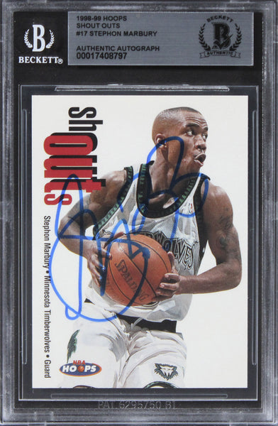 This Autographed 1998 Hoops Shout Outs #17 Card has been Personally Signed by Stephon Marbury of the Minnesota Timberwolves. This item is 100% Authentic, it comes slabbed and authenticated by Beckett Authentication Services. The authenticity can be verified on Beckett Authentication Services website.