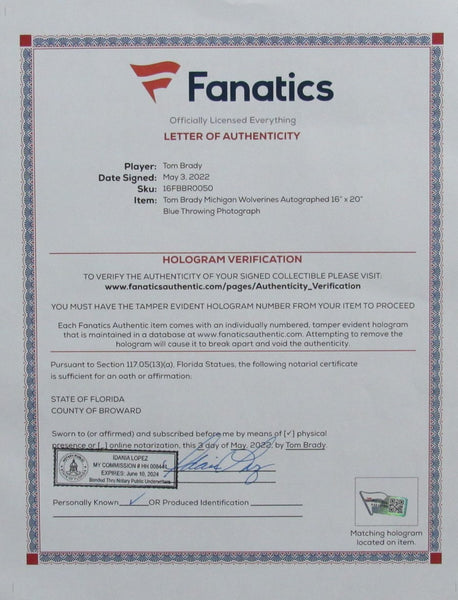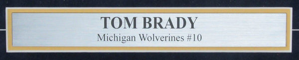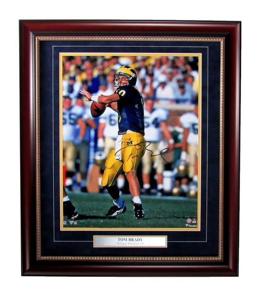 Tom Brady Autographed 16x20 Photo University of Michigan Wolverines Framed. The outer frame size is 24 inches x 28 inches. This photo is authenticated by Fanatics Authentic and includes their Tamper-proof Sticker and Letter of Authenticity.